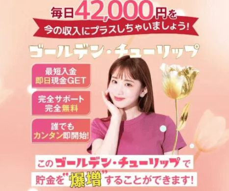 ゴールデン・チューリップは、「毎日42,000円が稼げる」「スマホだけで完結」「完全無料」「最短即日入金」「誰でもすぐ始められる」といったフレーズでユーザーを集めているスマホ副業案件です。 ランディングページでは、短時間・低負担で高い日給が得られるようなイメージが強調され、特に副業初心者や未経験者に刺さるコピーが並んでいます。