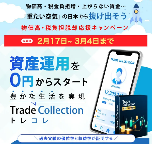 Trade Collection(トレードコレクション、通称トレコレ)は、「自動売買システムで仮想通貨・FX・株式を運用」「初心者でも安定収入」「株式会社RuckUpが運営する安心の資産運用サービス」と宣伝されていますが、特商法の不備・誇大広告・口座開設誘導+高額ツール販売の手口から、詐欺まがいの投資案件として利用を避けるべき高リスク副業です。